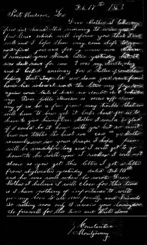 Letter to Cerene Montgomery from her son Constantine during the Civil War 18 Feb 1863.
